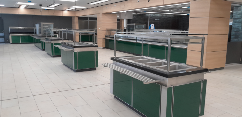 Die Sanierung des architektonisch bedeutenden Gebäudes erforderte ein hohes Maß an Fingerspitzengefühl im Umgang mit der historischen Bausubstanz. Gleichzeitig wurde die Mensa technisch auf den neuesten Stand gebracht – mit modernen Ausgabestationen, energieeffizienter Küchentechnik und einem durchdachten Frischküche-Konzept.